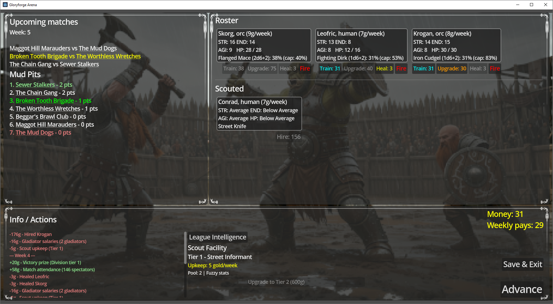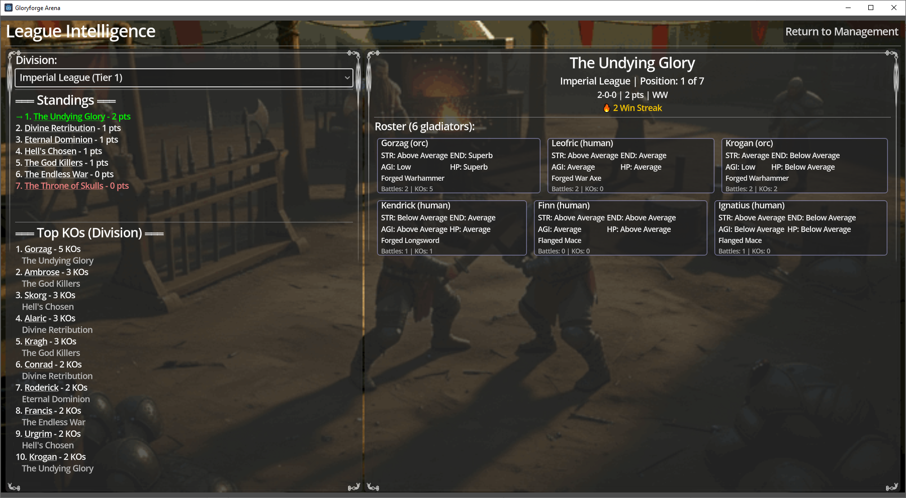 Build a gladiator team from scratch and battle through a ruthless 5-division league. Tactical turn-based combat meets sports management in this arena where only the strongest rise to the top. Scout talent, train warriors, and fight for glory — or face relegation to the depths.